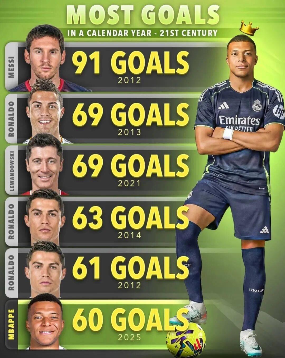当然,需要说明的是,自然年打进69球的其实还有2021年的莱万。不过这份榜单里,排在C罗和莱万后面的,还是C罗自己,他还曾在2014年打进63球,2012年打进61球。而且,还是C罗和梅西更配一些。